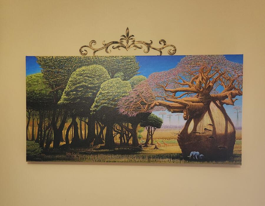"This is a stunning work of art! It is my absolute favorite piece by this artist. The detail in the trees is amazing. The contrast in size between the animals and the tree make this really stand out. The intensity of color in the sky and leaves is so pretty. This is a striking piece of art. So glad I purchased it."